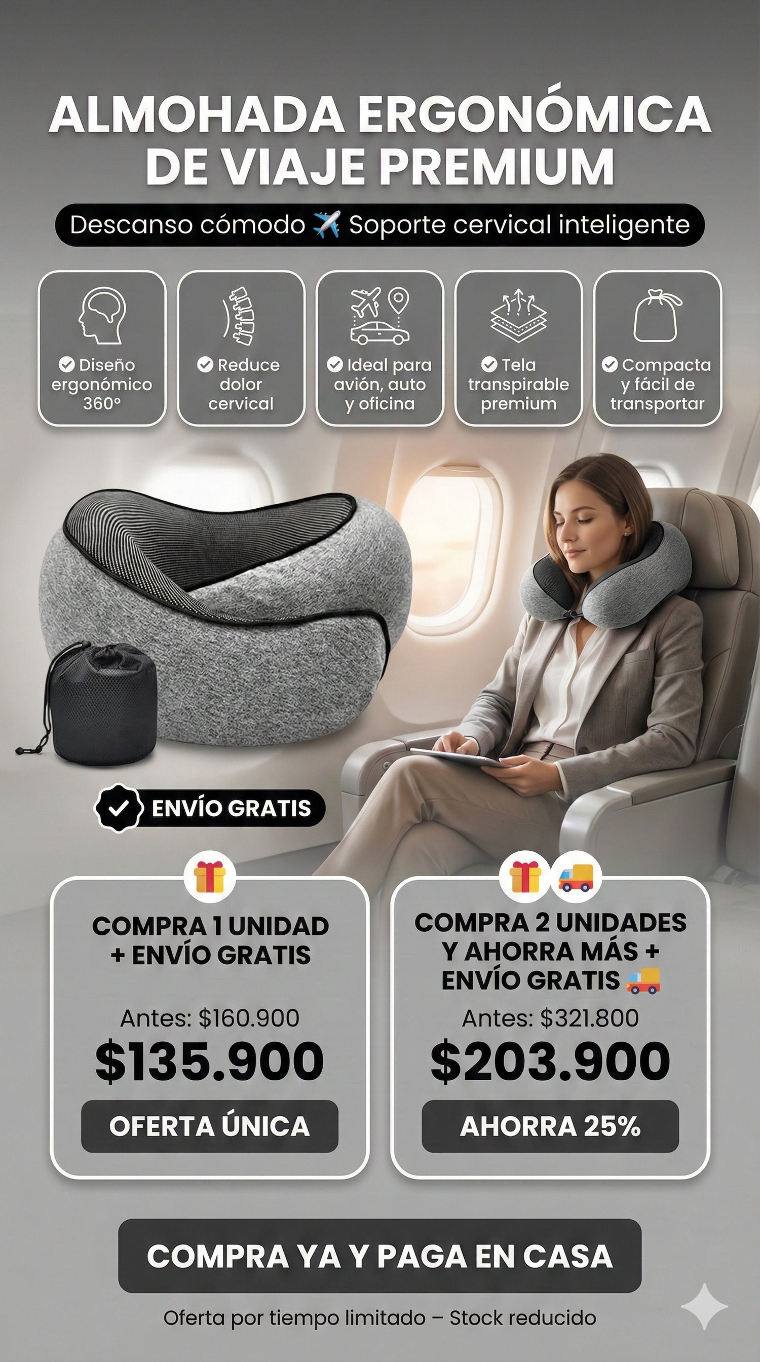 La almohada de viaje transforma por completo la comodidad al viajar. Su diseño avanzado actúa sobre la causa principal de las molestias cervicales, proporcionando un alivio inmediato y duradero. Perfecta tanto para desplazamientos diarios como para viajes largos, garantiza el máximo soporte para el cuello y la cabeza.