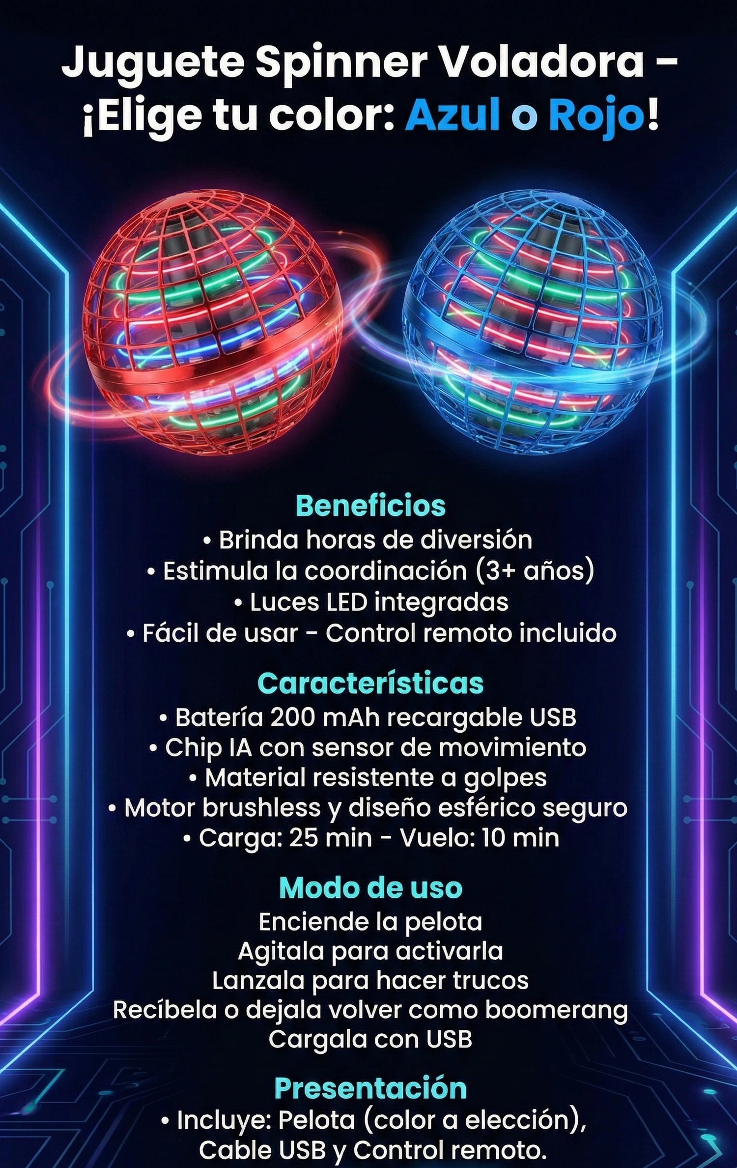 La diferencia del JUGUETE SPINNER VOLADOR: Este no es el típico juguete de lanzar y atrapar. Su sistema de propulsión Dynamic Force-Feedback™ crea una trayectoria mágica ✨ diferente con cada lanzamiento. En un instante flota, al siguiente asciende y regresa a tus manos como si estuviera vivo. 🛸🙌